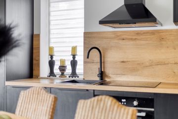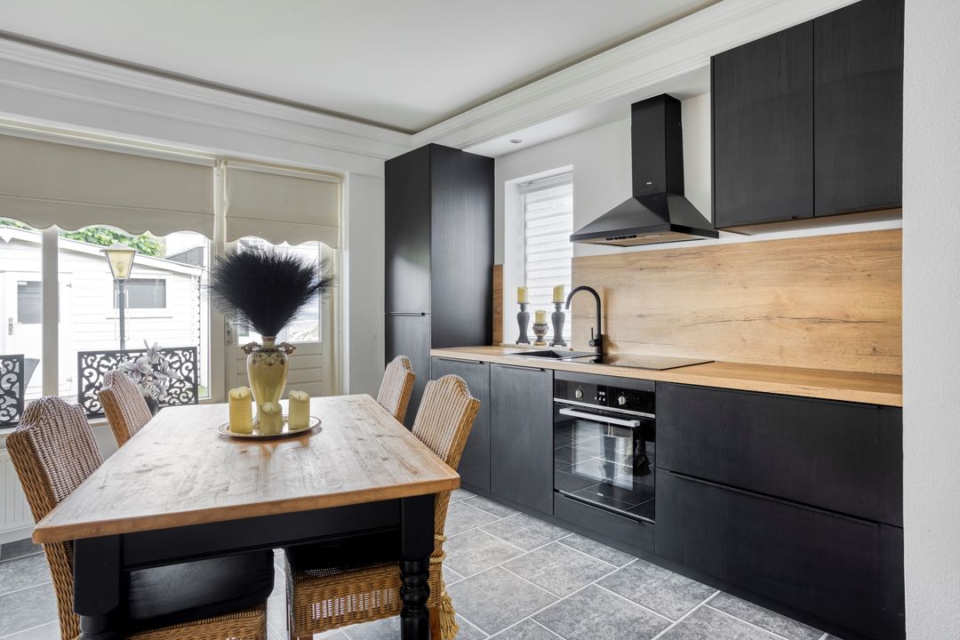 * Open keuken met moderne inbouwkeuken voorzien van diverse inbouwapparatuur t.w.: 4-pits inductie kookplaat, vaatwasser, 2 koelkasten, oven en afzuigkap.