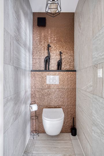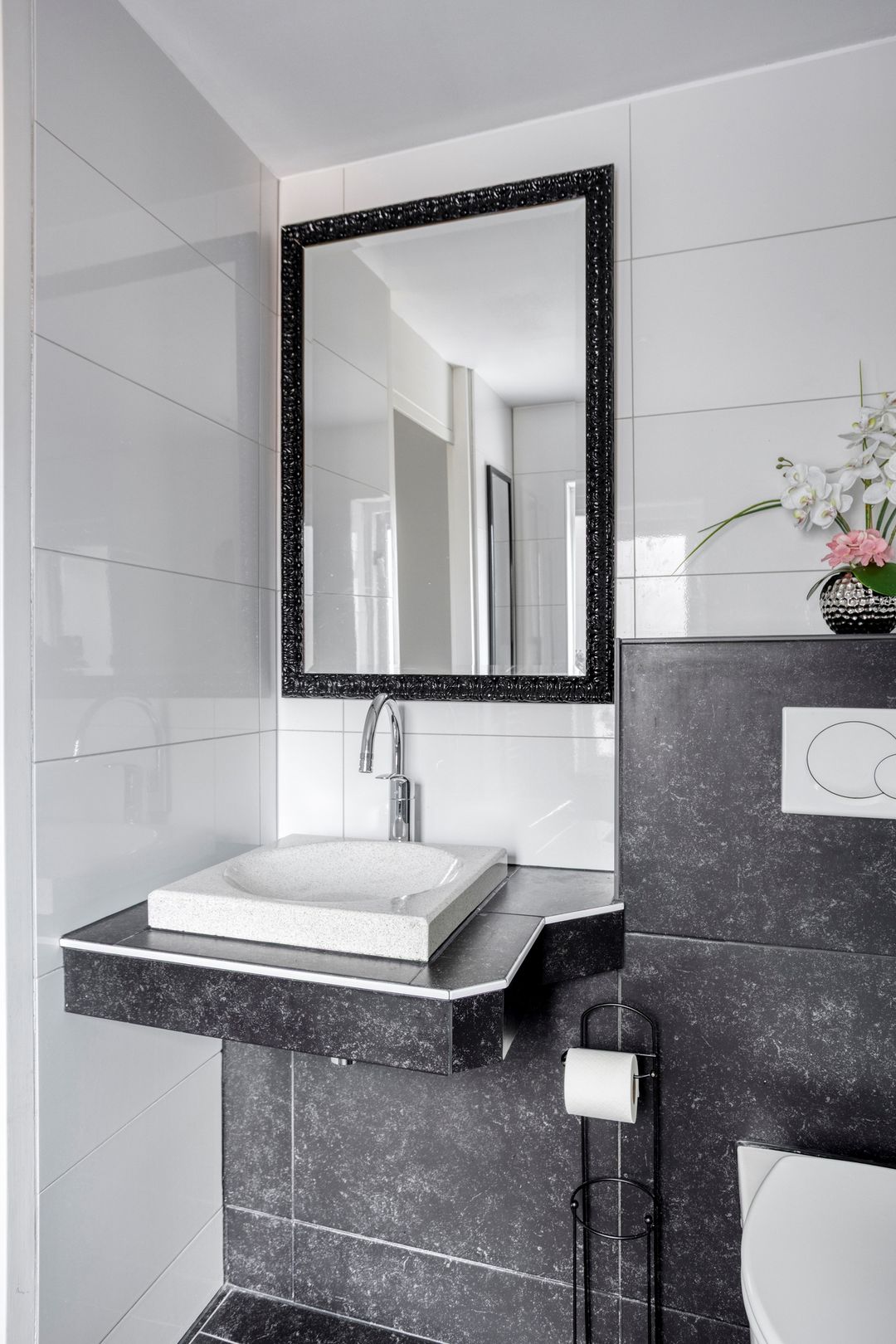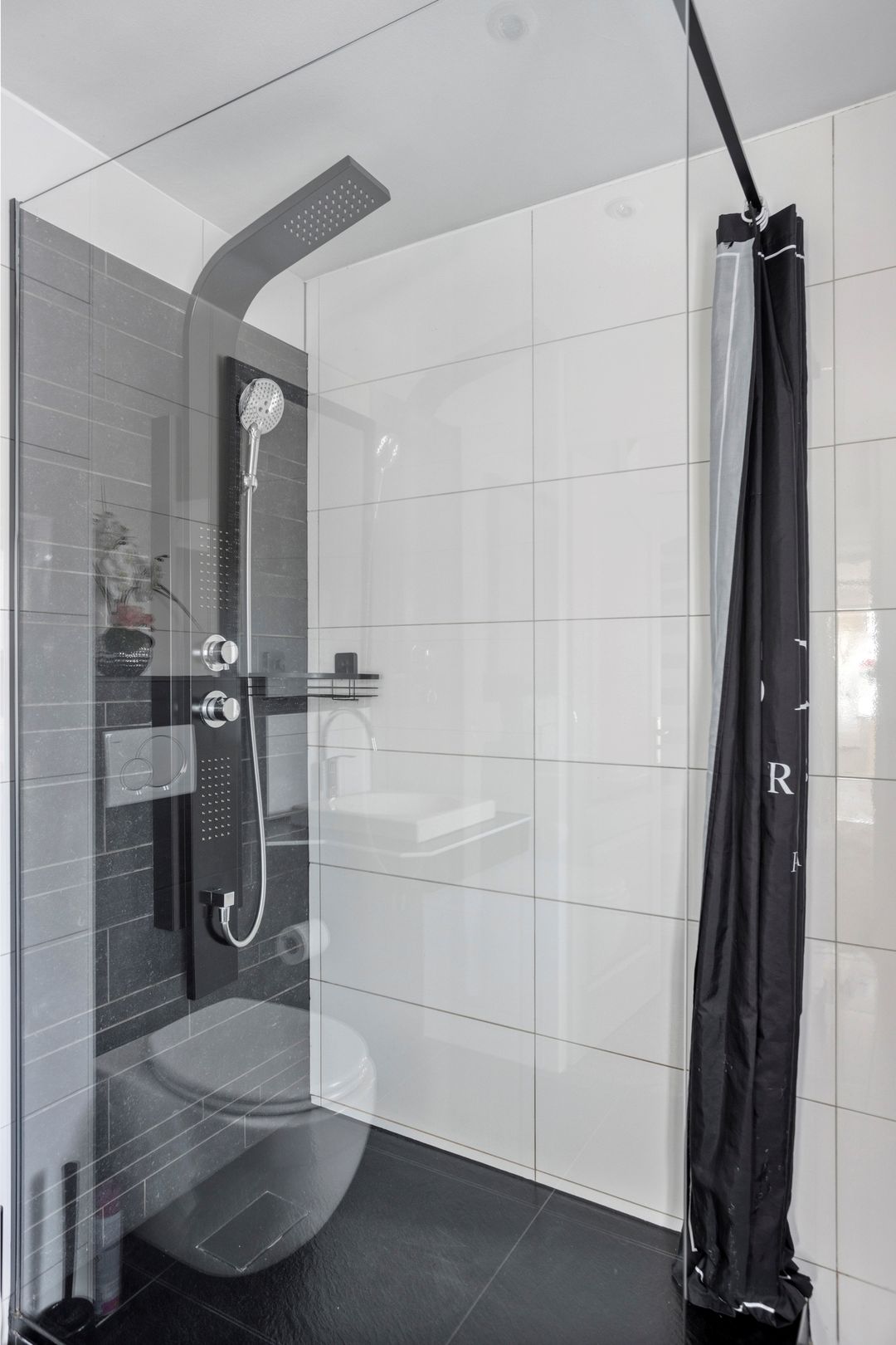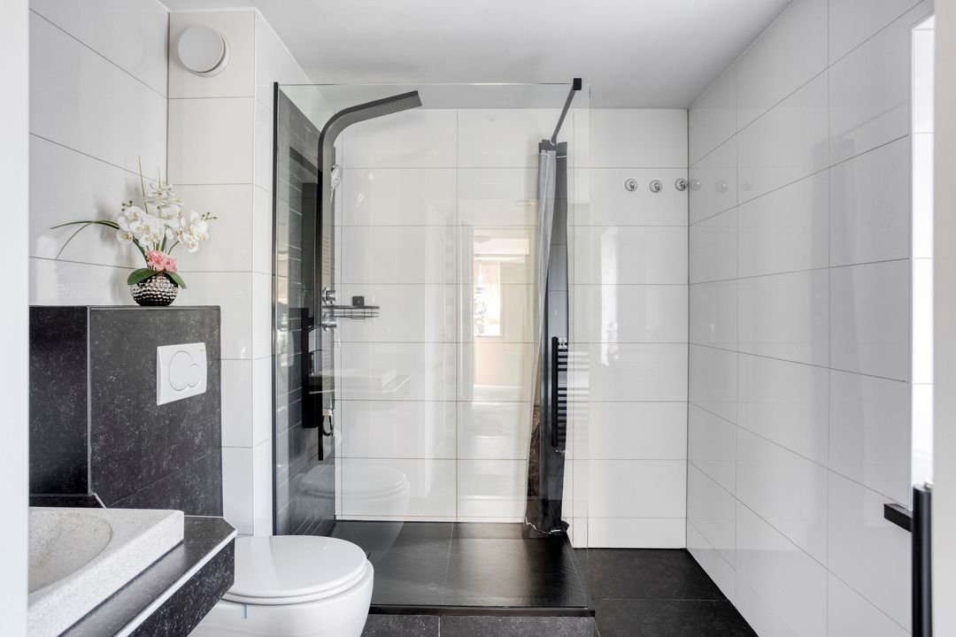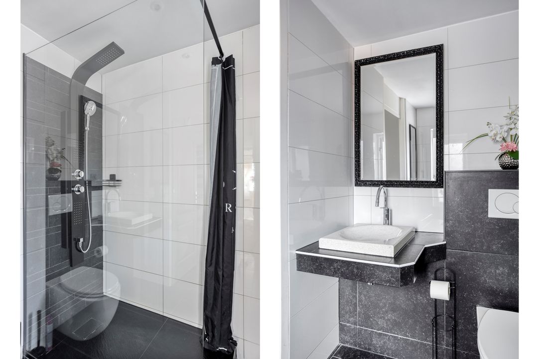 * Royale moderne badkamer (2.28m x 2.15m) met inloopdouche (met hand- en regendouche), hangend toilet, wastafel en designradiator. Inbouwspotjes in het plafond.