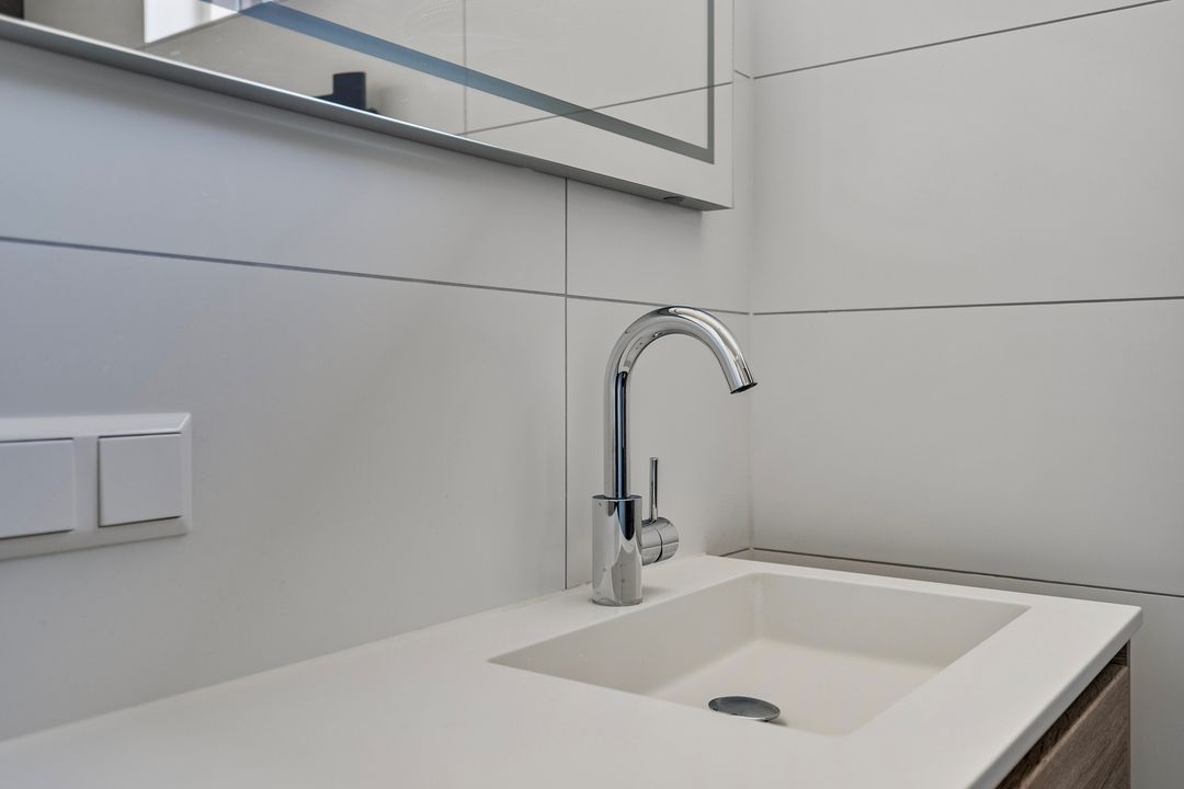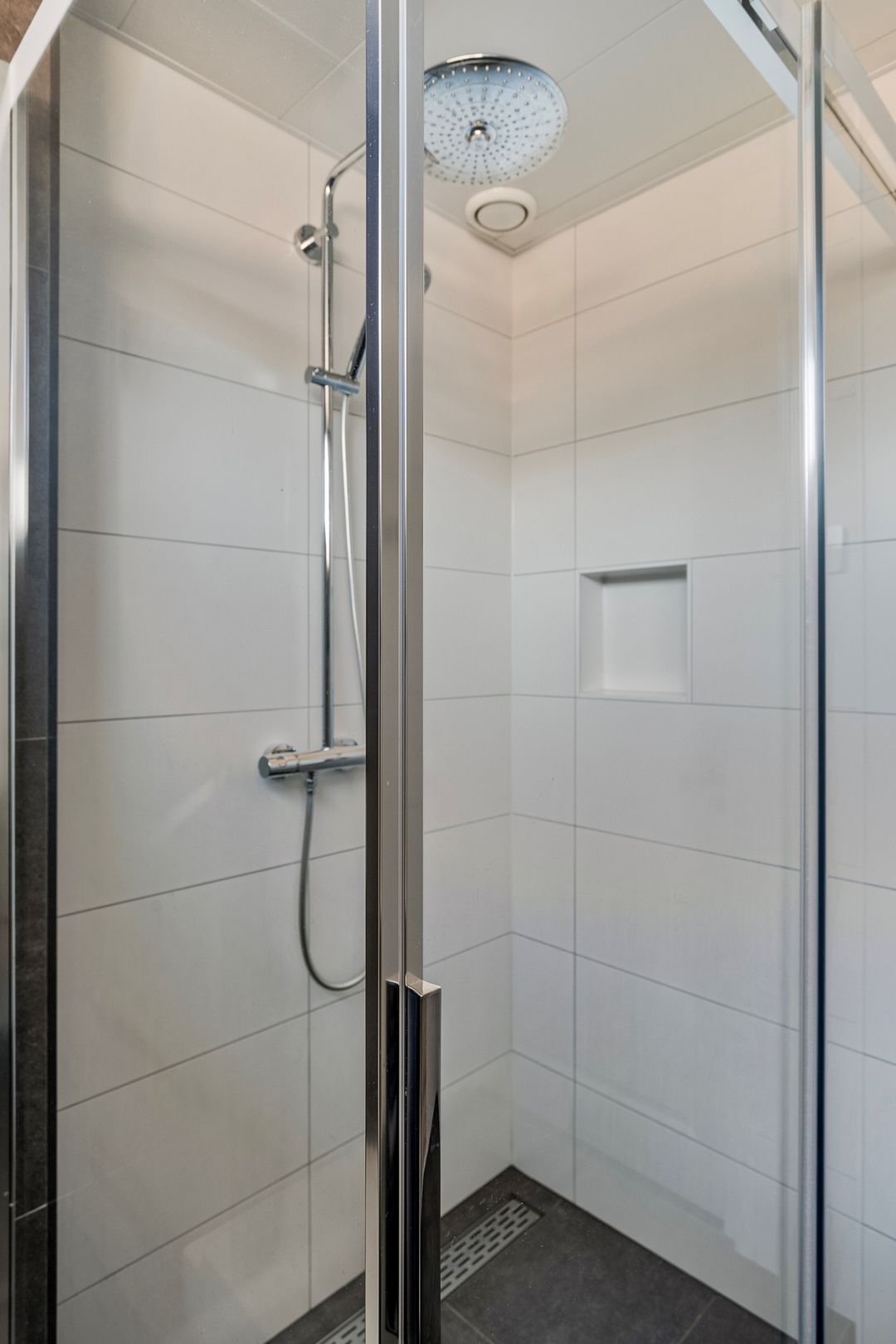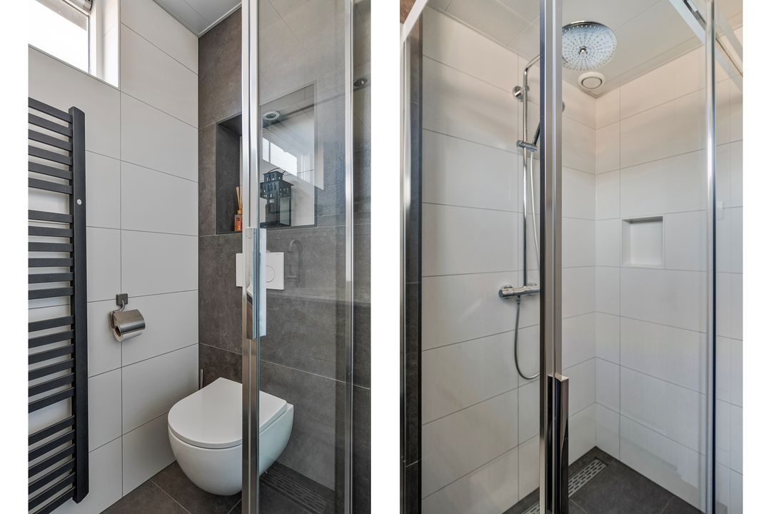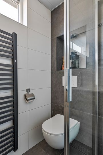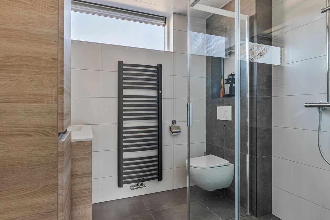 * Moderne badkamer (2.25m x 2.14m) met inloopdouche (met hand- en regendouche), hangend toilet, wastafel en designradiator. De badkamer is voorzien van vloerverwarming en mechanische afzuiging.