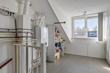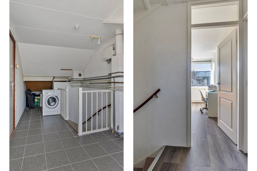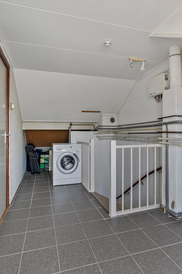 * Overloop met opstelplaats van de wasmachine-aansluiting en van de gas cv-combiketel. De cv-ketel type Remeha Zerra is in december 2024 vernieuwd. Mét dakkapel.