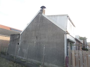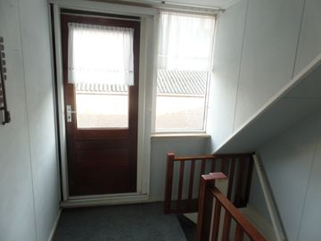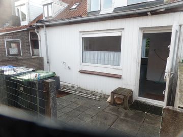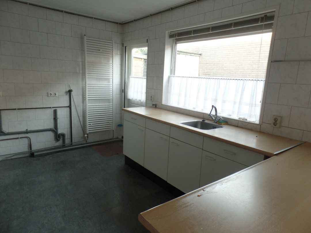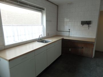 * Dichte keuken (afm. 4.00 x 2.50m) met eenvoudig keukenblok met 4 onderkastjes en met deur naar achterplaats.