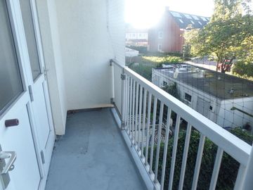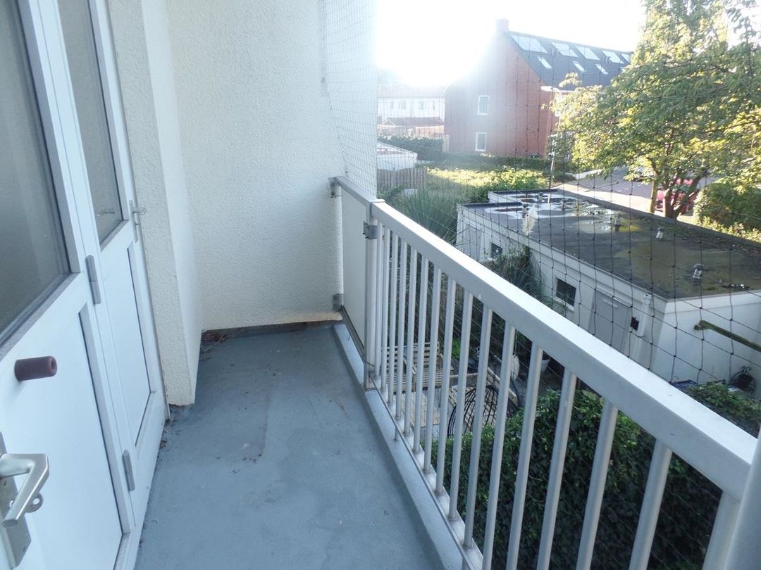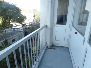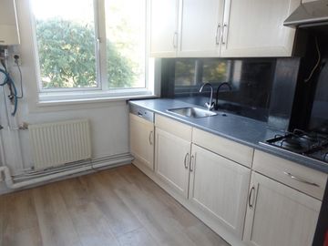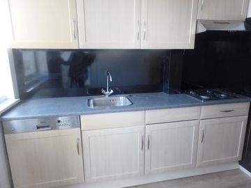 * Keuken met nette keukenblok met toegangsdeur naar het balkon aan de achterzijde.