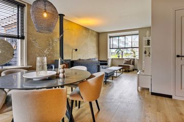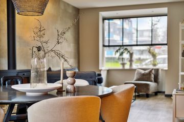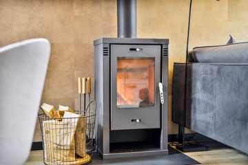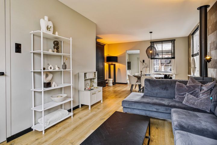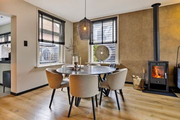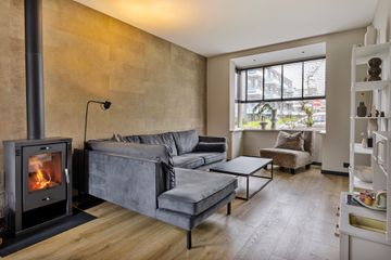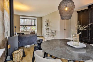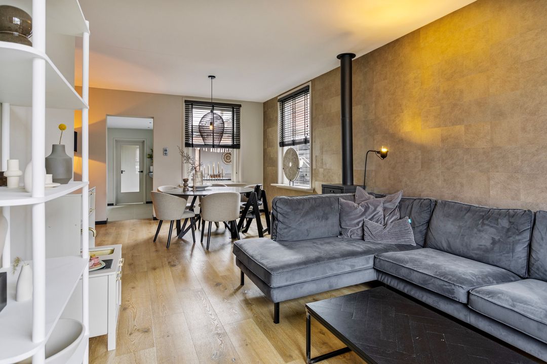 * Sfeervolle l-vormige woonkamer met houtkachel en toegang tot de keuken.