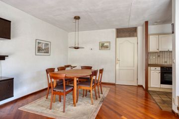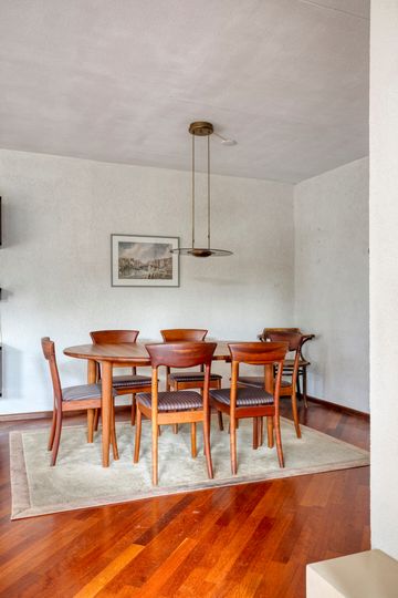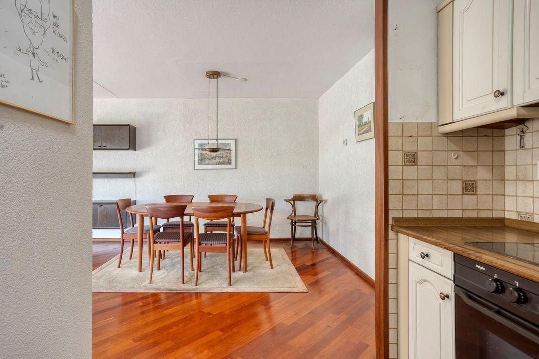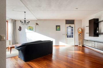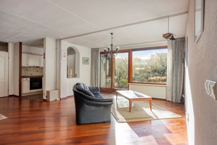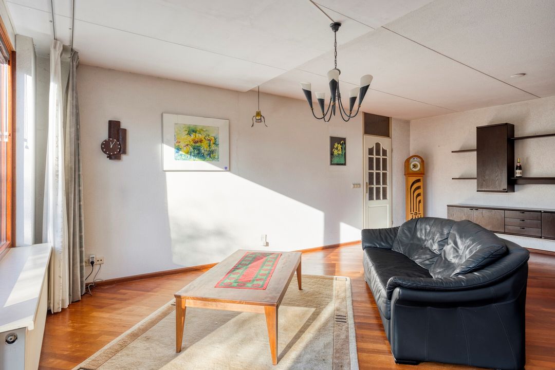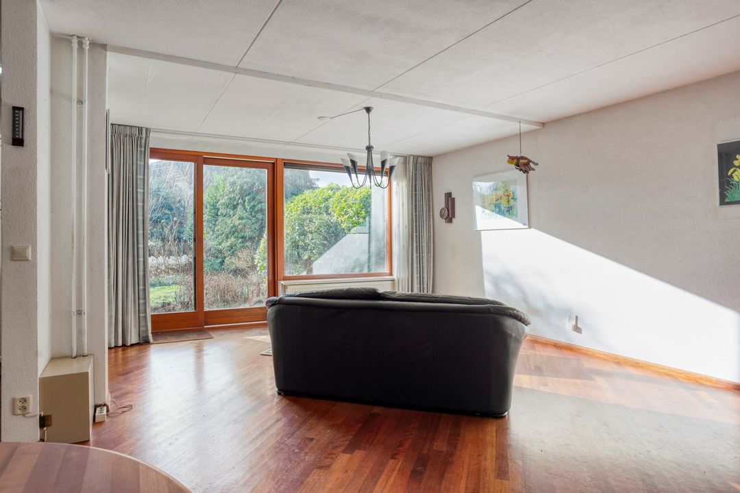 * Lichte l-vorminge woonkamer (ca. 35 m²) met parketvloer en schuifpui naar de achtertuin.