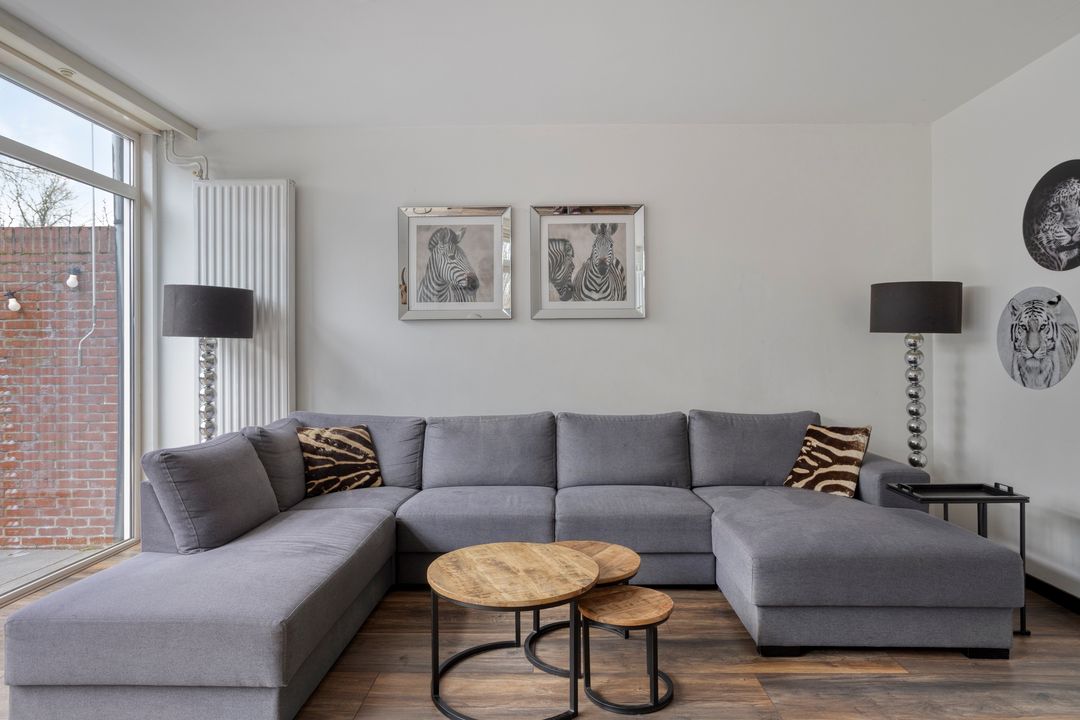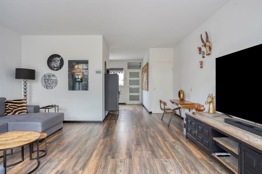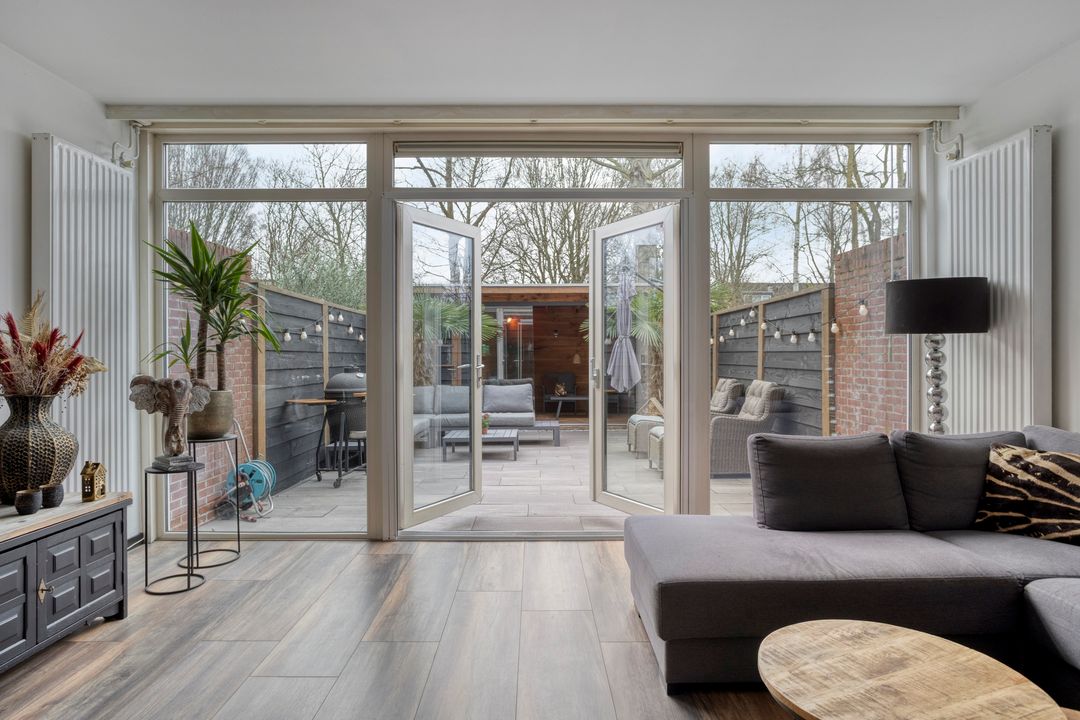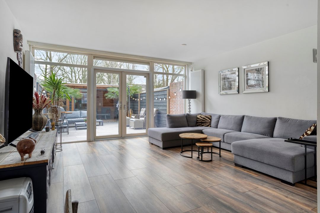 * Woonkamer (afm. 4.97 x 6.48 / 4.97m) met laminaatvloer en openslaande deuren naar achtertuin.