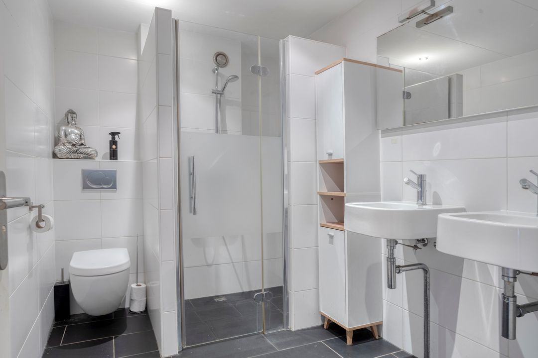 * Moderne badkamer (afm. 3.01 x 1.97m) voorzien van inloopdouche, 2e toilet en dubbele wastafel.