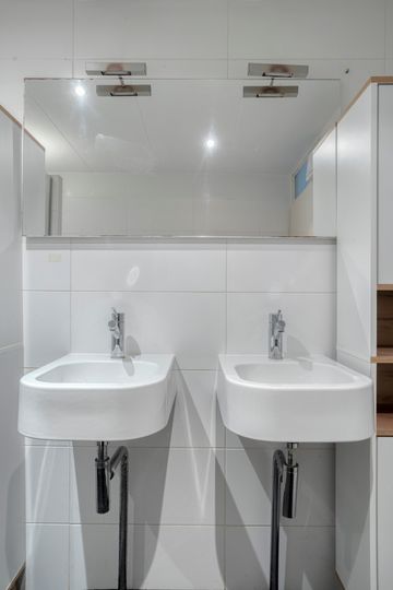 Douche, dubbele wastafel, toilet